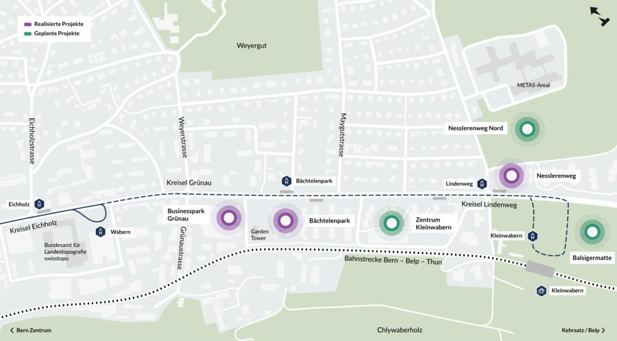 An der Endhaltestelle «Kleinwabern» entsteht ein neuer, attraktiver Umsteigeknoten für den öffentlichen Verkehr. Die BLS realisiert neben der Tram- und Bushaltestelle die neue S-Bahnstation «Kleinwabern». Zudem werden mehrere Buslinen die Haltestelle «Kleinwabern» bedienen.